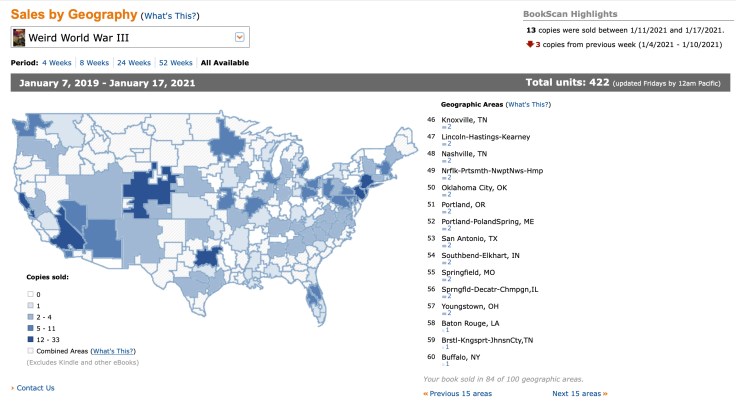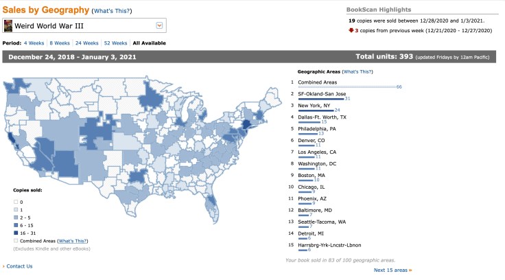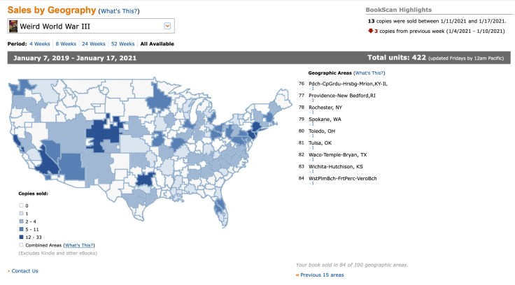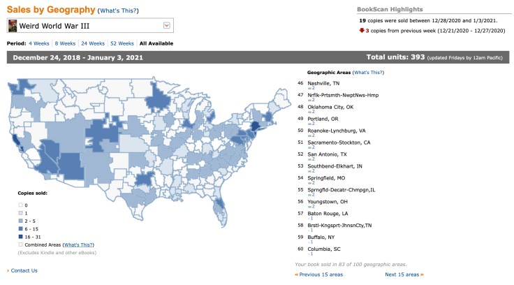 In the first sixteen weeks since launch, BookScan reported a total of 430 Weird World War III US retail print sales.