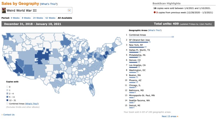 In the first fourteen weeks since launch, BookScan reported a total of 409 Weird World War III US retail print sales.
