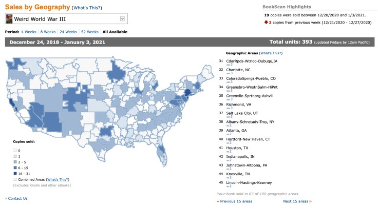 In the first fifteen weeks since launch, BookScan reported a total of 422 Weird World War III US retail print sales.