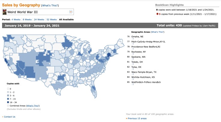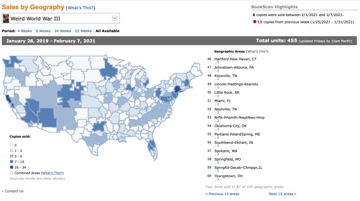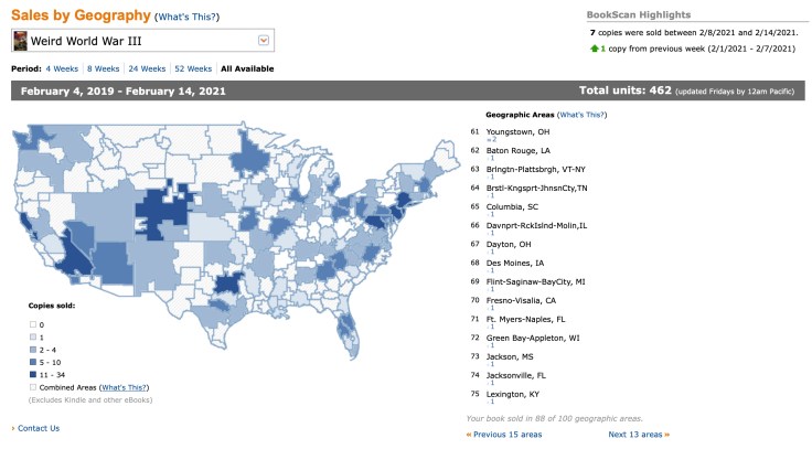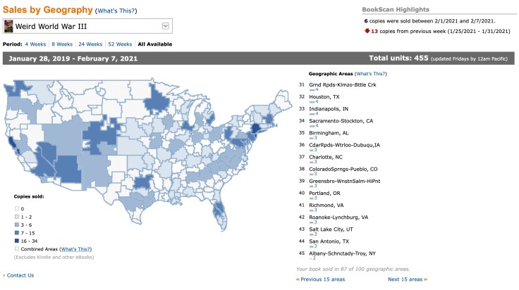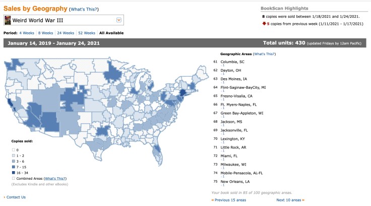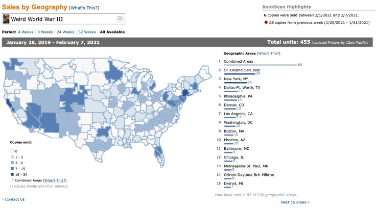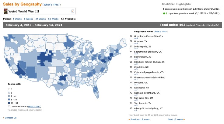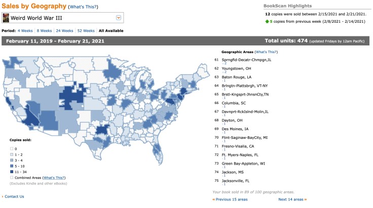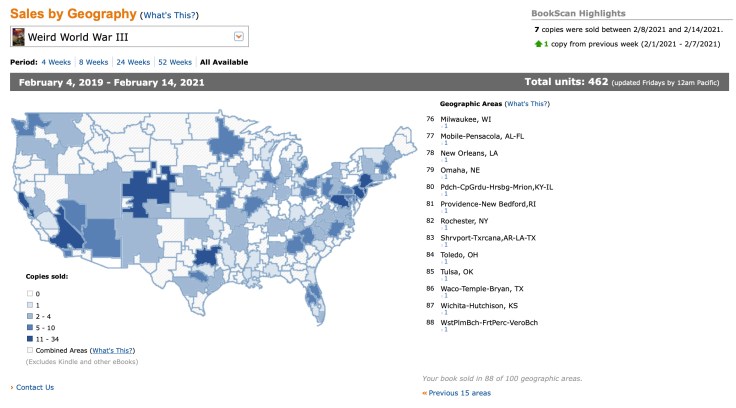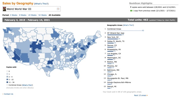 In the first twenty weeks since launch, BookScan reported a total of 474 Weird World War III US retail print sales.
