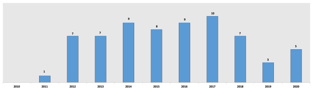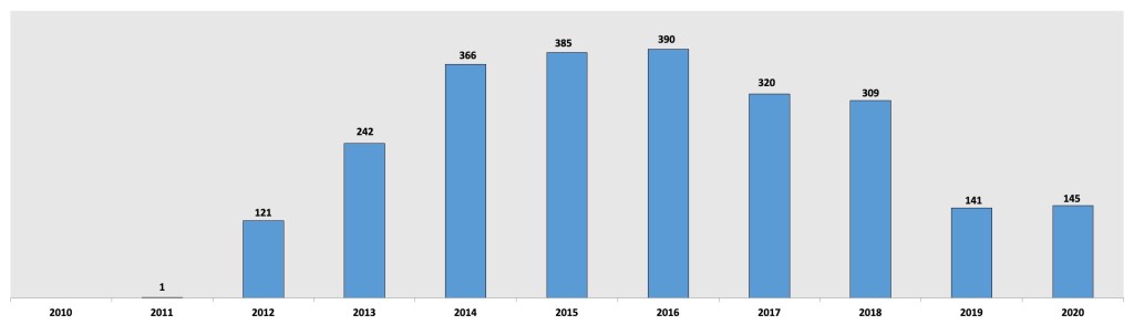 You can’t win if you don’t play, and the more you play, the more you win. For a relatively unknown author, the writing game is one that rewards persistence. There’s also a huge element of luck. Sometimes you have to hit the right editor at the right time with the right story. You can’t do that if you aren’t constantly taking shots on goal. As such, from 2014 to 2016, I’d consistently submitted at least one story a day to various publications. Since my acceptance rate doubled from 2015 to 2016, I sent fewer submissions in 2017 and 2018, primarily so I could spend more time writing than submitting. I continued to follow this strategy in 2019 to 2021, but I had far fewer submissions, mostly because I had written only 10 new short stories / novellas over that three-year period.