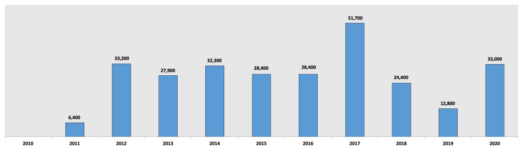 As I noted above, an alternative way of looking at productivity is how many polished words I completed in a year. From that perspective, 2021 was my fourth most productive short story / novella writing year on record with 32,900 completed words, which is roughly flat with 2020’s 33,000 words.