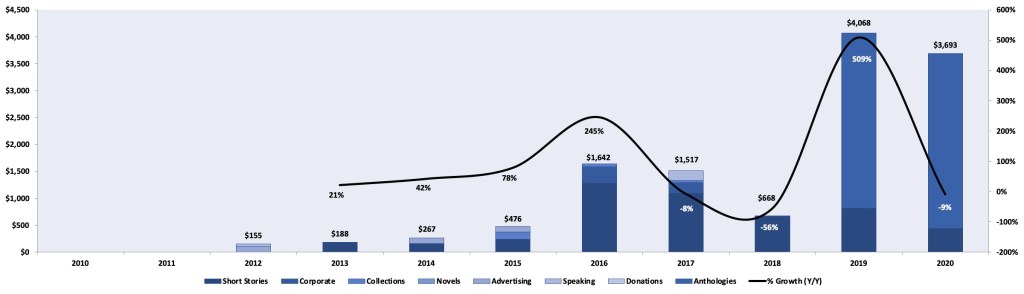 While the revenue numbers above are still low, my revenue growth rate has roughly doubled each year from 2013 to 2015 and tripled in 2016โa marked improvement. Then revenue declined–down 8% in 2017 and down 56% in 2018. In 2019, revenue shot up by 509%, primarily due to a partial advance on a short story anthology. Excluding this advance, my revenue would have been up 23% in 2019. Revenue was down 9% in 2020, but up substantially in 2021 (+1,031%) and driven primarily by my teaching revenue. Short story revenue was up 181%, anthology revenue was up 23%, and revenue on my first collection was up 59%. 2022’s backlog is standing now at roughly 54% of 2021 revenue, so 2022 is already shaping up to be a great year.