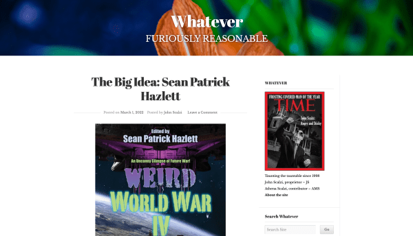 - Sean Patrick Hazlett, “The Big Idea: Sean Patrick Hazlett“, whatever.scalzi.com, 1 March 2022